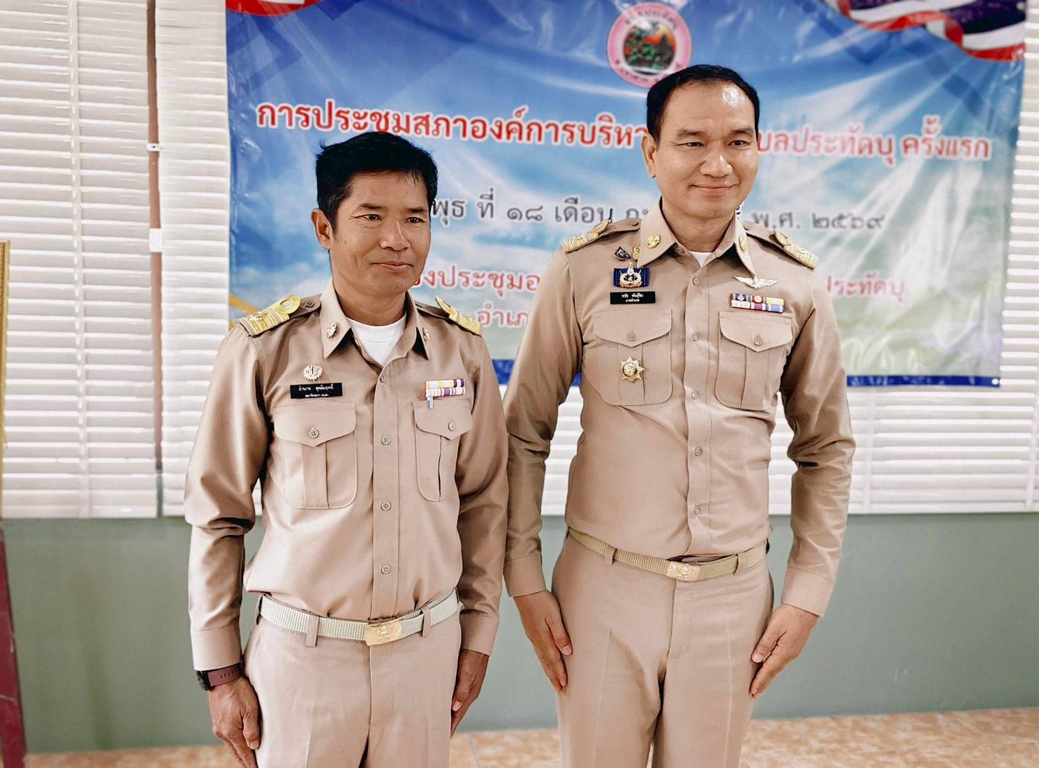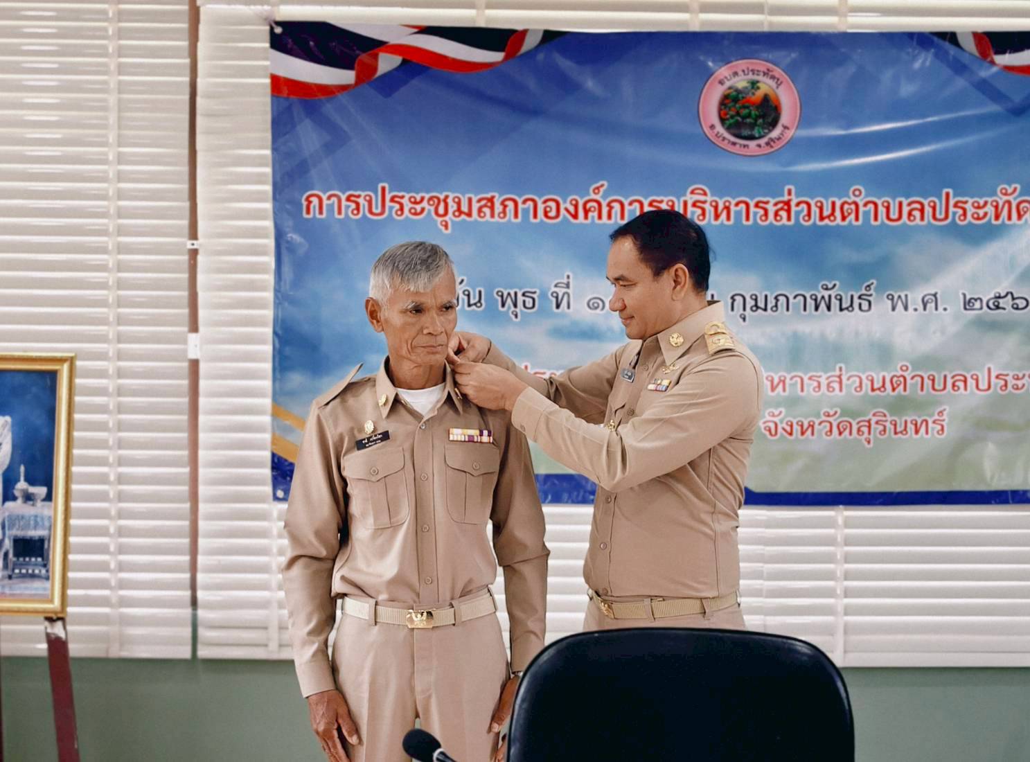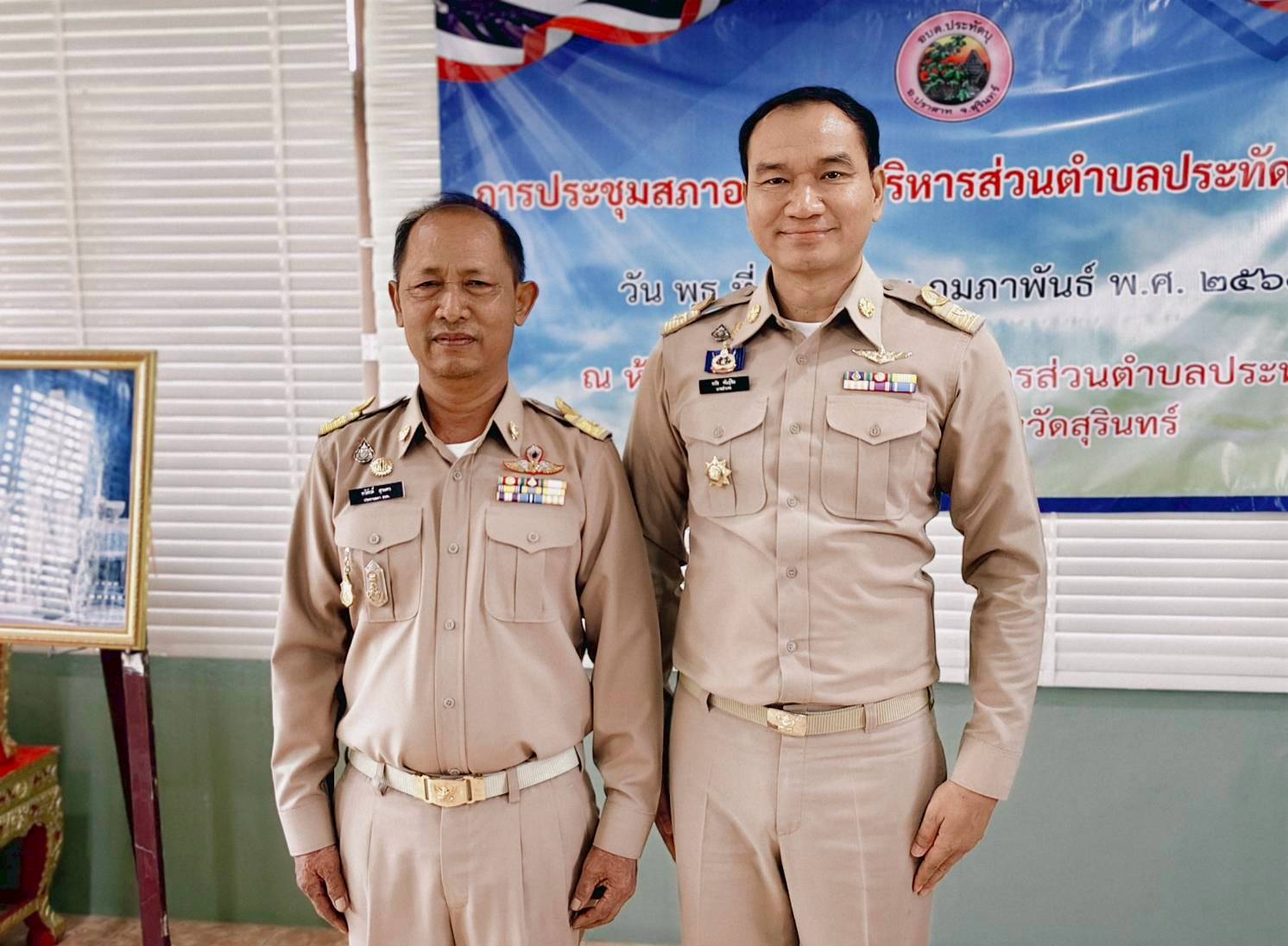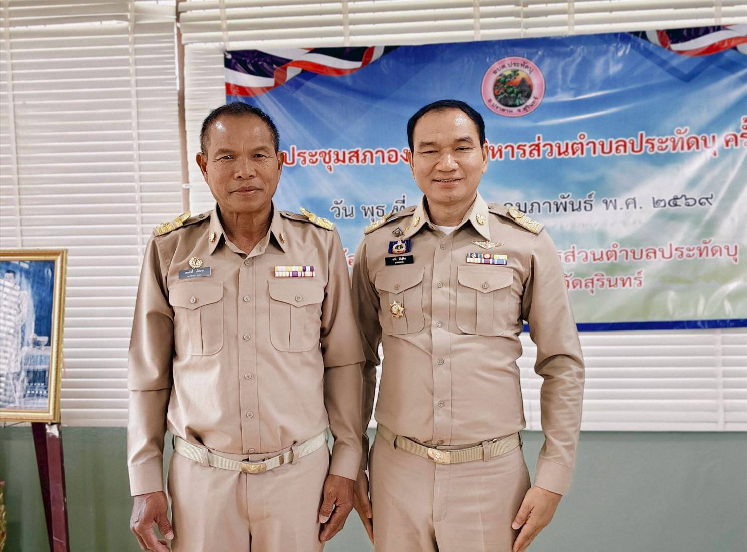 นายอำเภอปราสาท แสดงความยินดีและประดับอินทนูให้แก่นายกอบต.และสมาชิกสภาอบต.ประทัดบุ ในการประชุมสภาฯ ครั้งแรก เมื่อวันที่ 18 กุมภาพันธ์ 2569 ณ ห้องประชุมสภาองค์การบริหารส่วนตำบลประทัดบุ