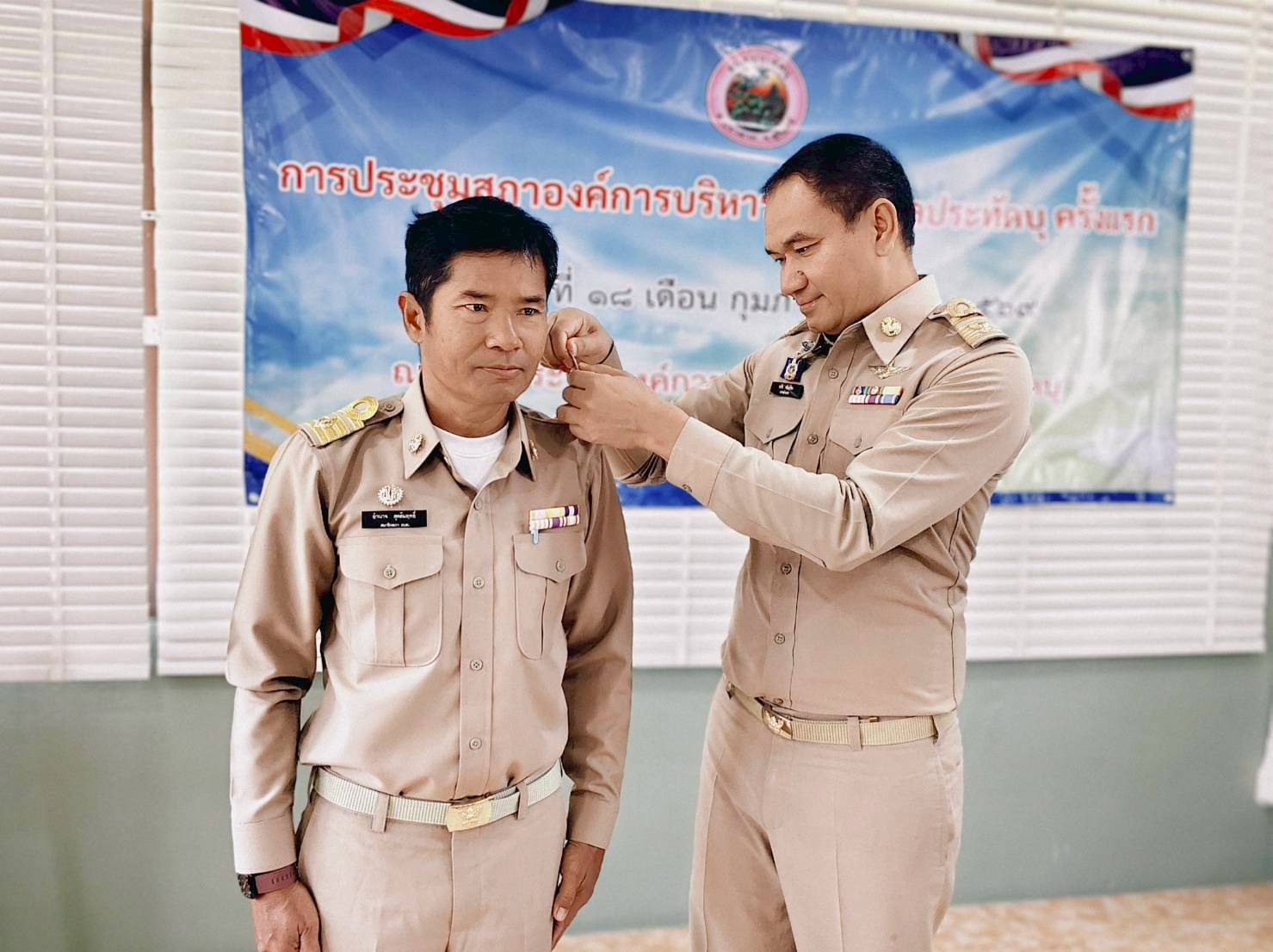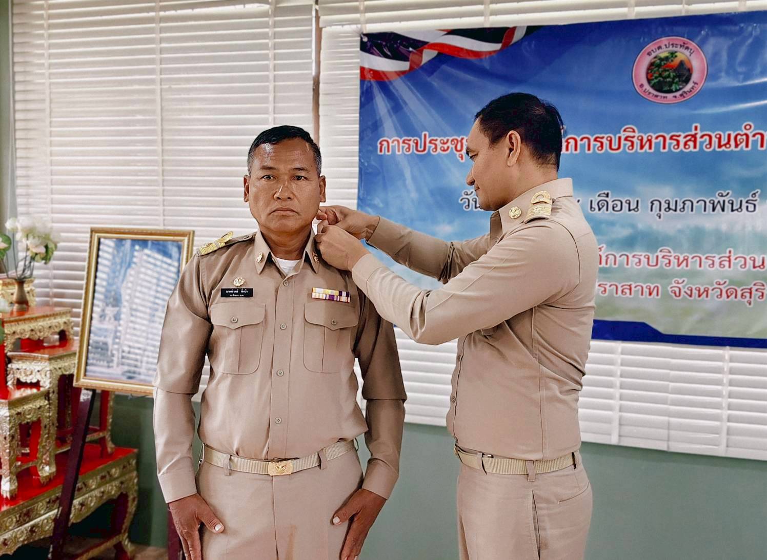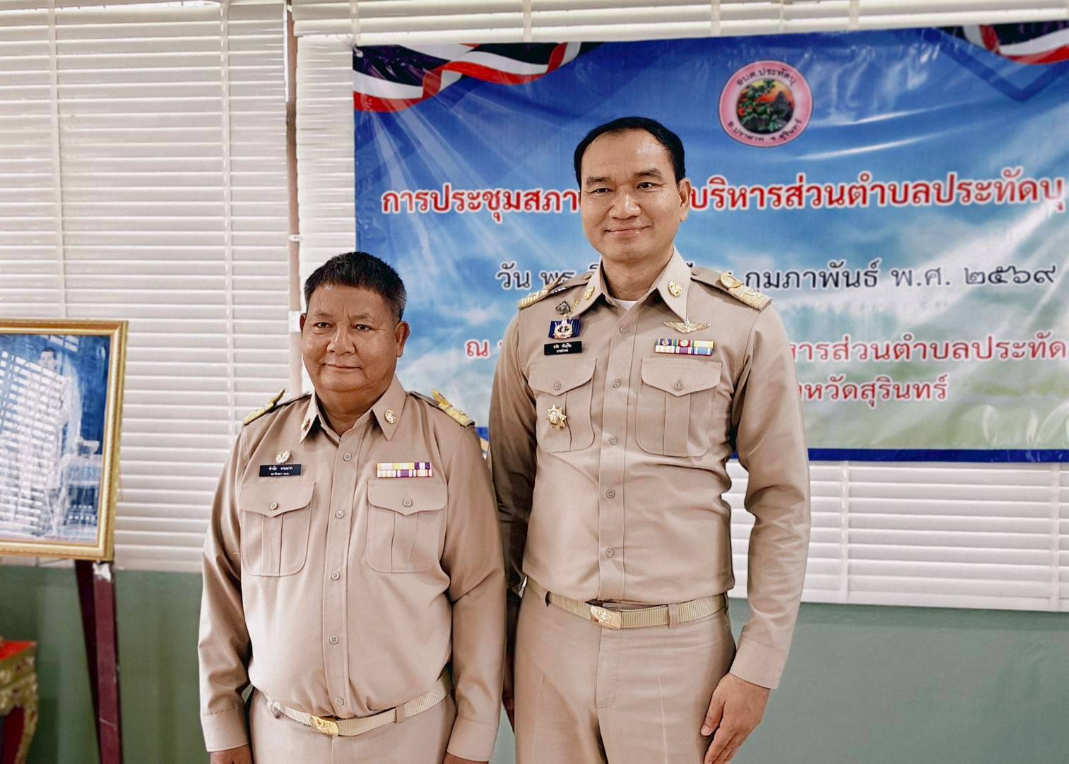 นายอำเภอปราสาท แสดงความยินดีและประดับอินทนูให้แก่นายกอบต.และสมาชิกสภาอบต.ประทัดบุ ในการประชุมสภาฯ ครั้งแรก เมื่อวันที่ 18 กุมภาพันธ์ 2569 ณ ห้องประชุมสภาองค์การบริหารส่วนตำบลประทัดบุ